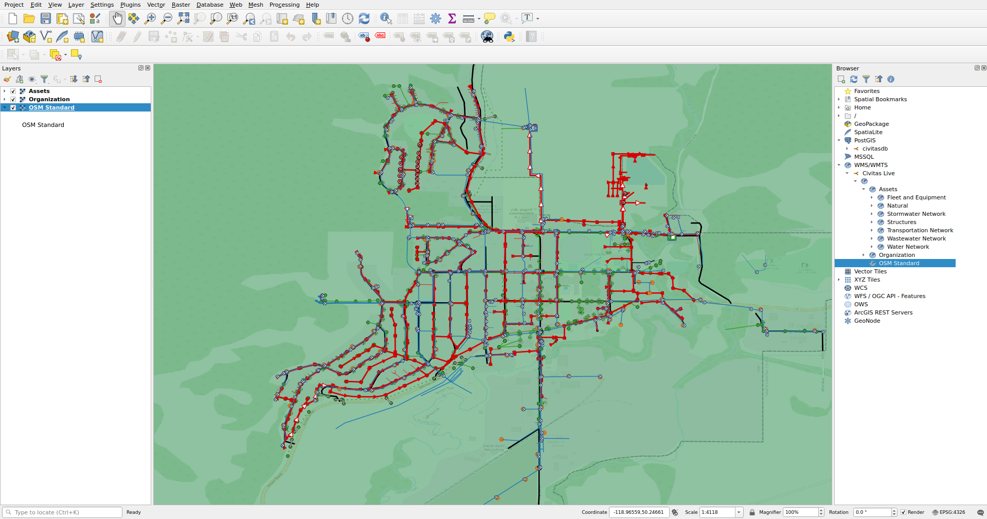 Fig.1 - QGIS Desktop View: Operators use QGIS desktop to capture assets using a formal, well structured data model.
