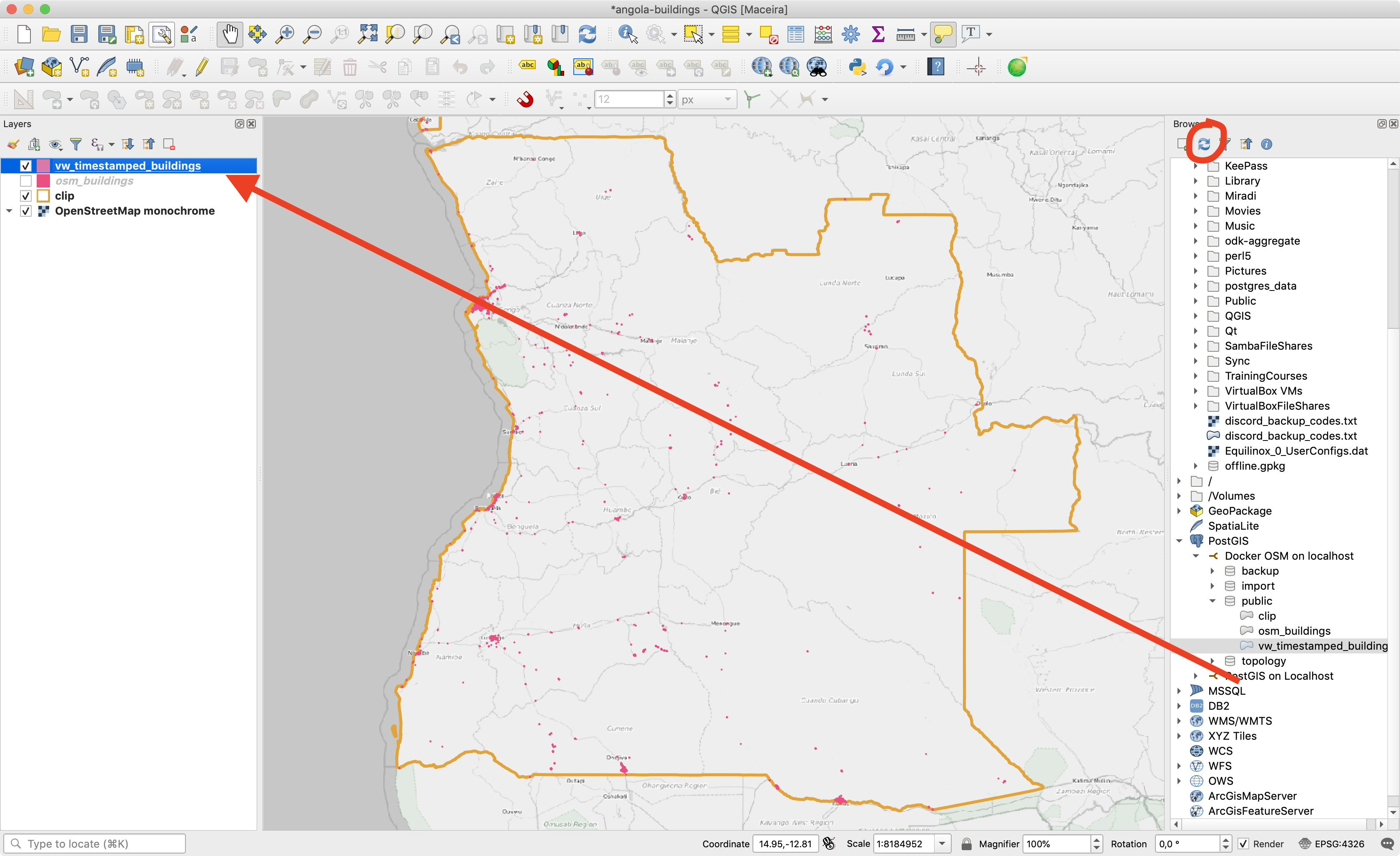 Now refresh your browser panel using the (circled below) refresh icon and then drag the view into your project. Create a bold style for your view based layer so that the buildings will be easy to see when you animate the time series.