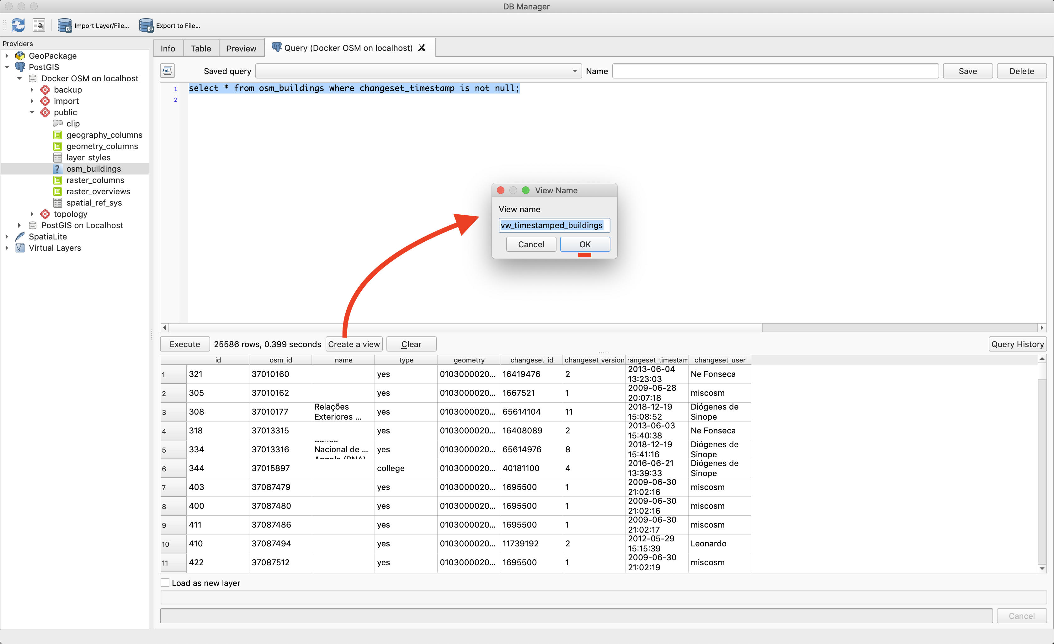 6) Using dbmanager to run arbitrary queries against your PostGIS database and create a view