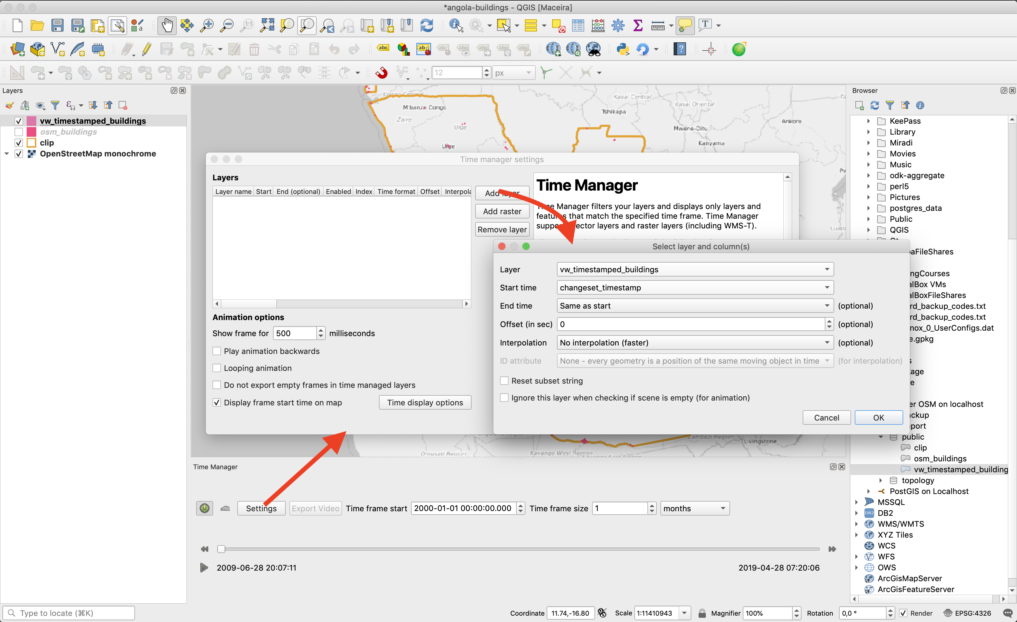 7) Use time manager in QGIS to animate the data in your OSM mirror