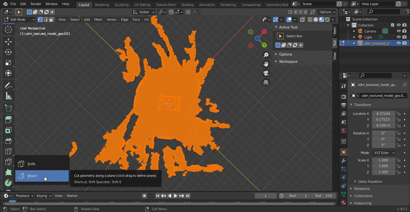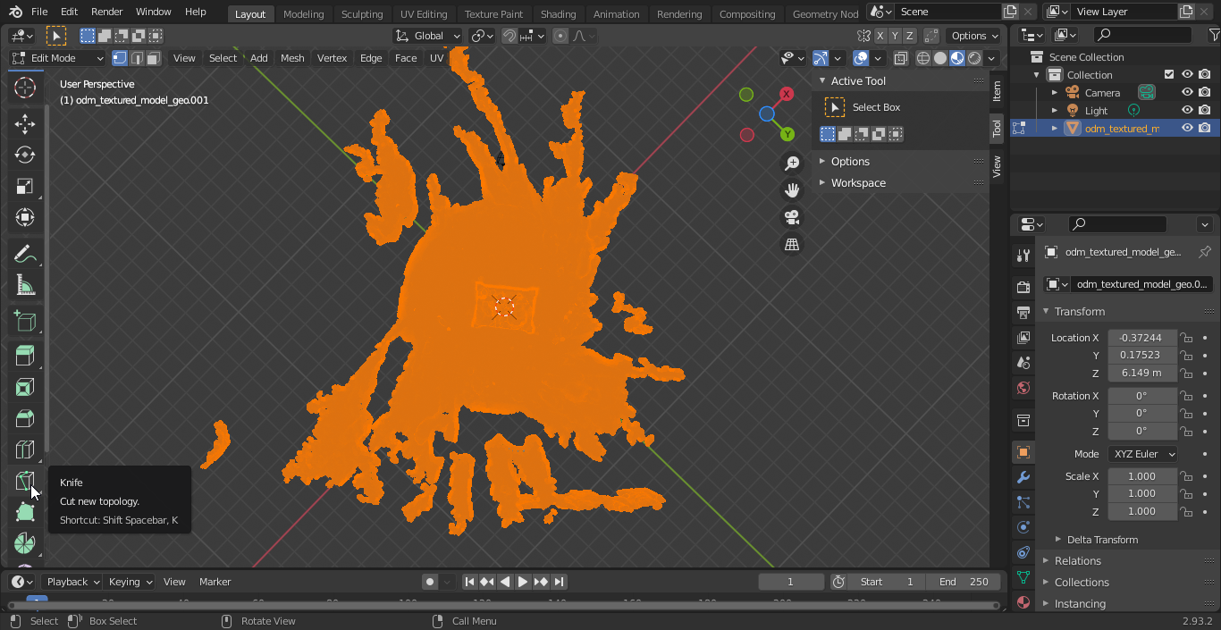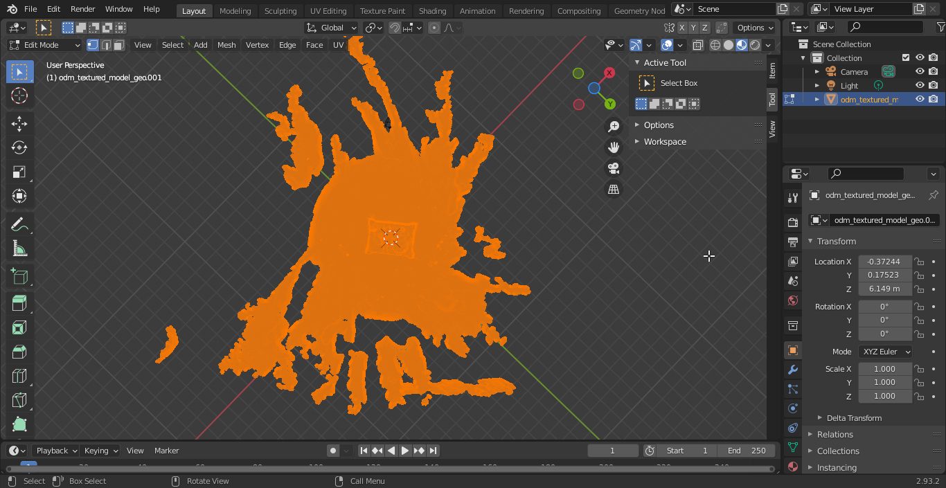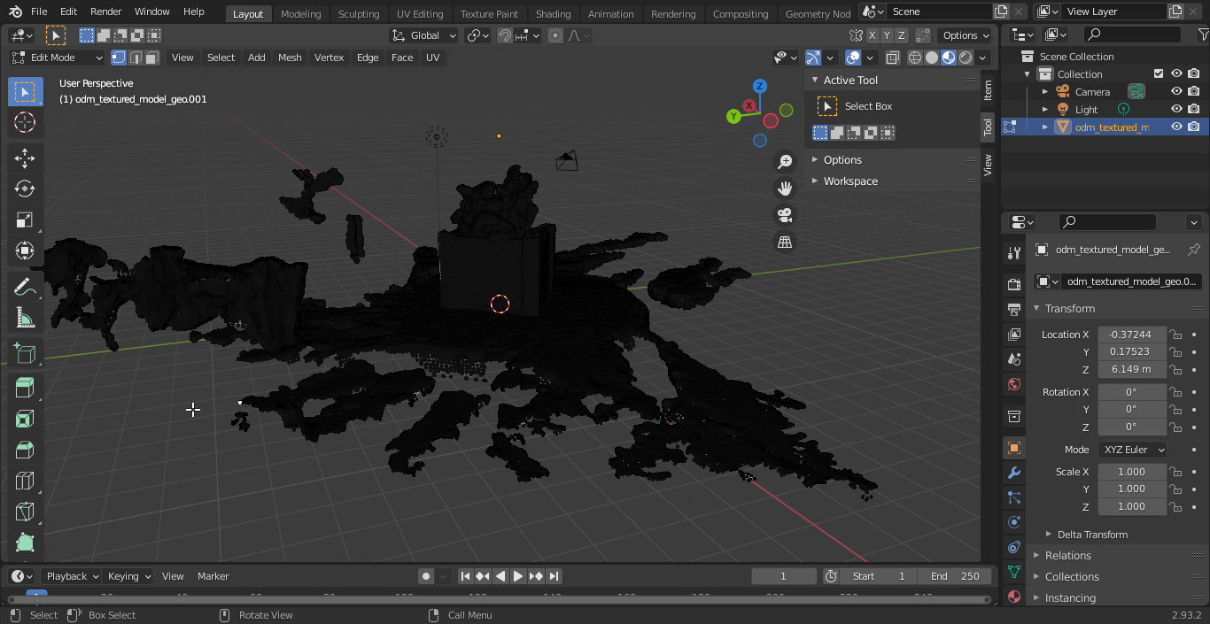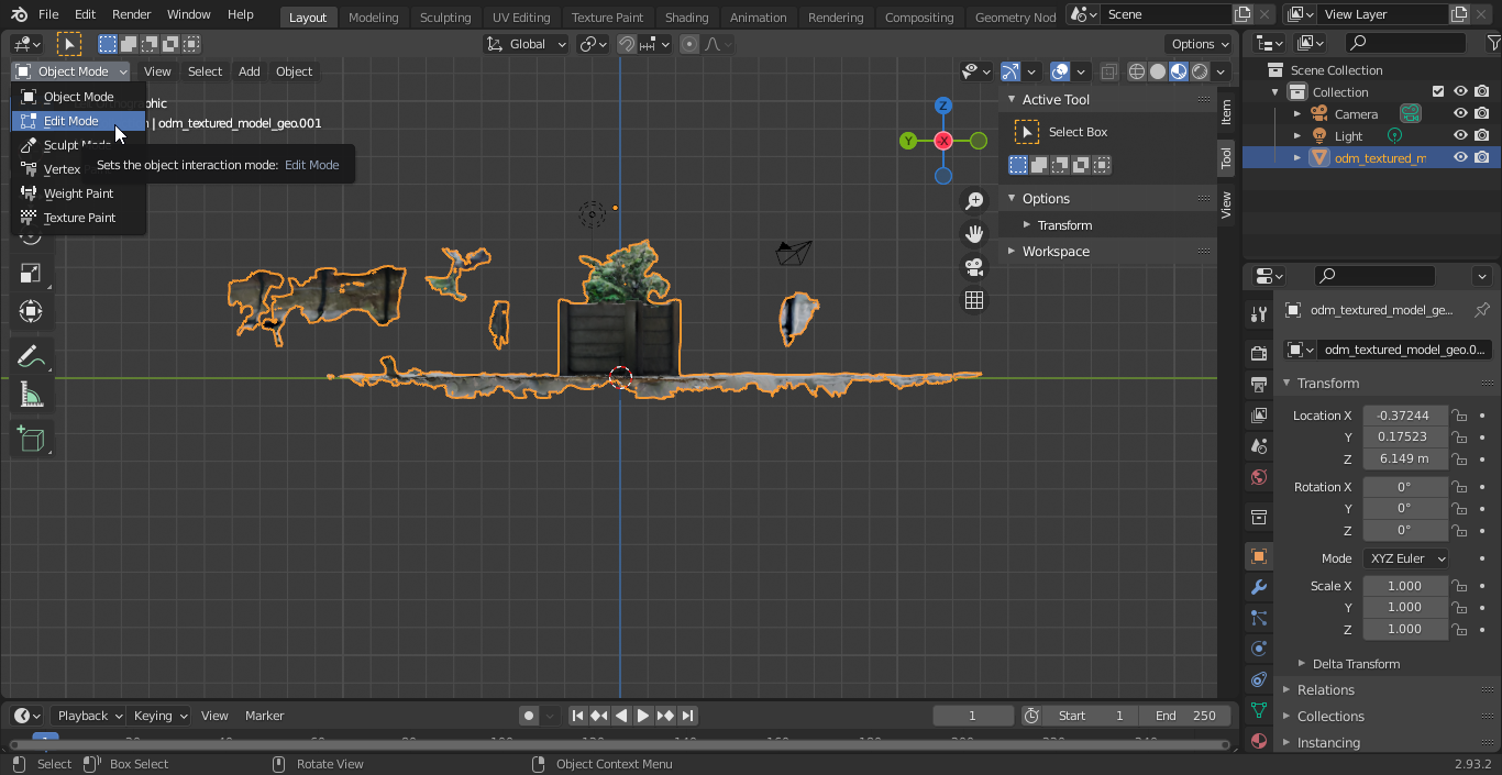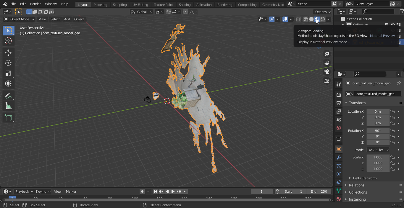Move the textured_model.zip file into your working directory and unzip it. The Wavefront OBJ file to be imported into Blender is the textured_model/odm_textured_model_geo.obj.