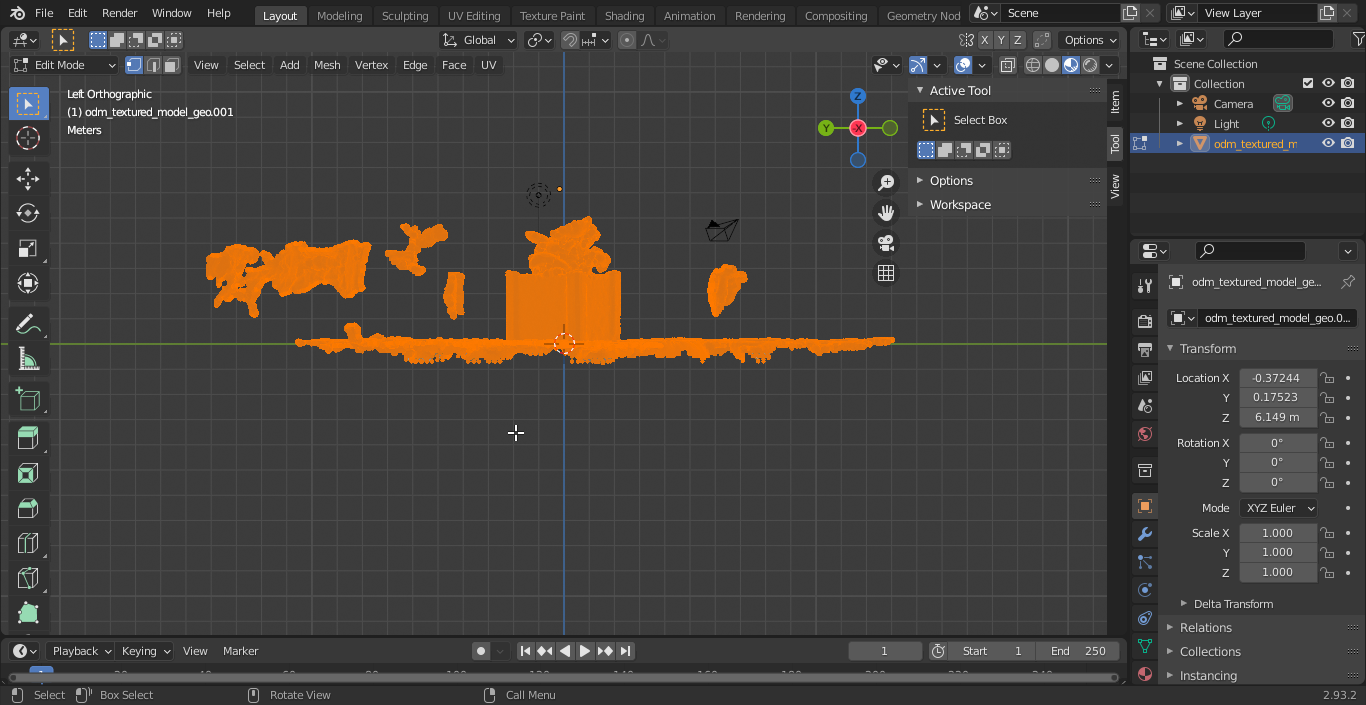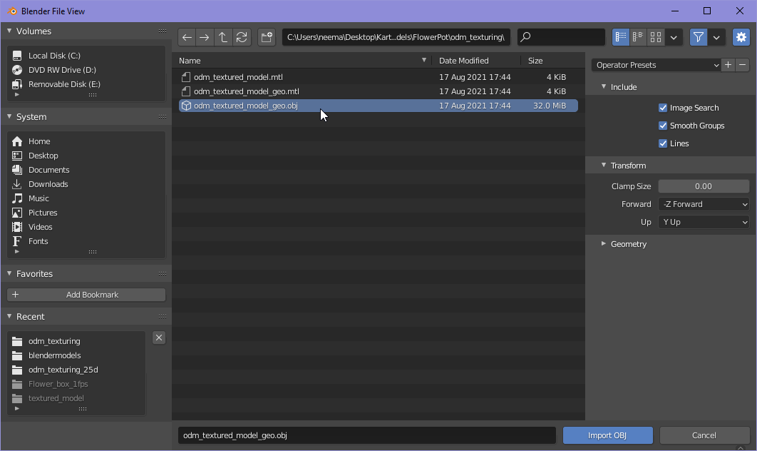 If you used the ODM processing steps outlined in Way two, the Wavefront OBJ file to be imported into Blender is the odm_texuring/odm_textured_model_geo.obj.