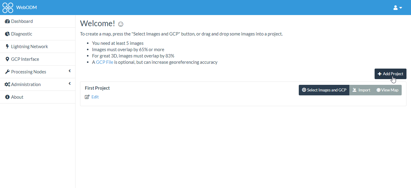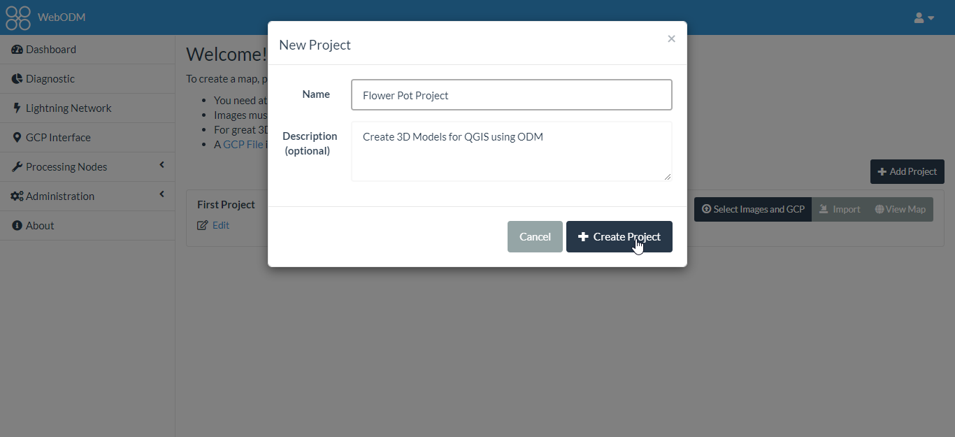 1. Create a new project in WebODM using the Add project button. Name the project and add an optional project description.
