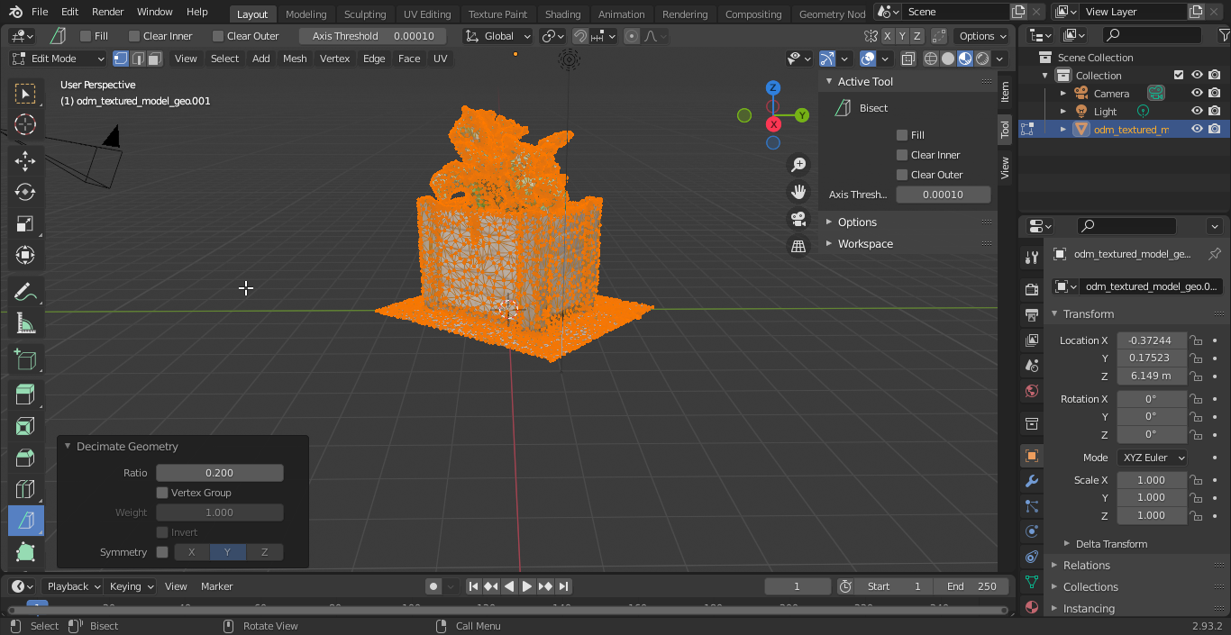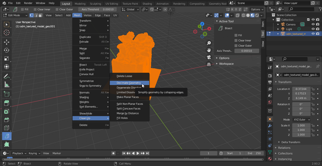 Next we want to simplify the model as much as possible. QGIS is going to grind to a halt if you ask it to render complex models as symbols so we are going to 'decimate' the geometry such that it maintains its form but loses as many vertices as possible. You need to jump back into edit mode for this.