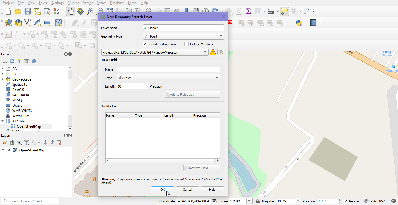 Next hop over to QGIS and make a new project with the OpenStreetMap XYZ layer added and create a scratch point layer with the Z value. Make sure to use EPSG:3857 for the project CRS and the new point layer CRS: