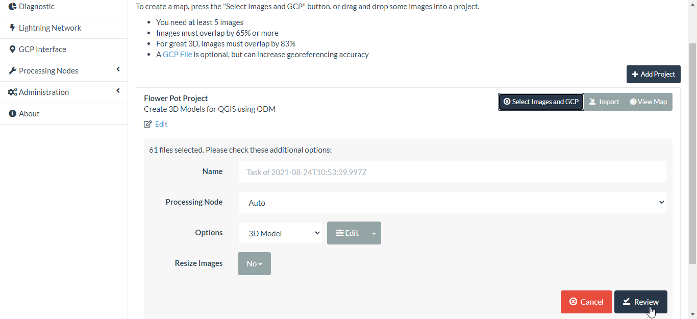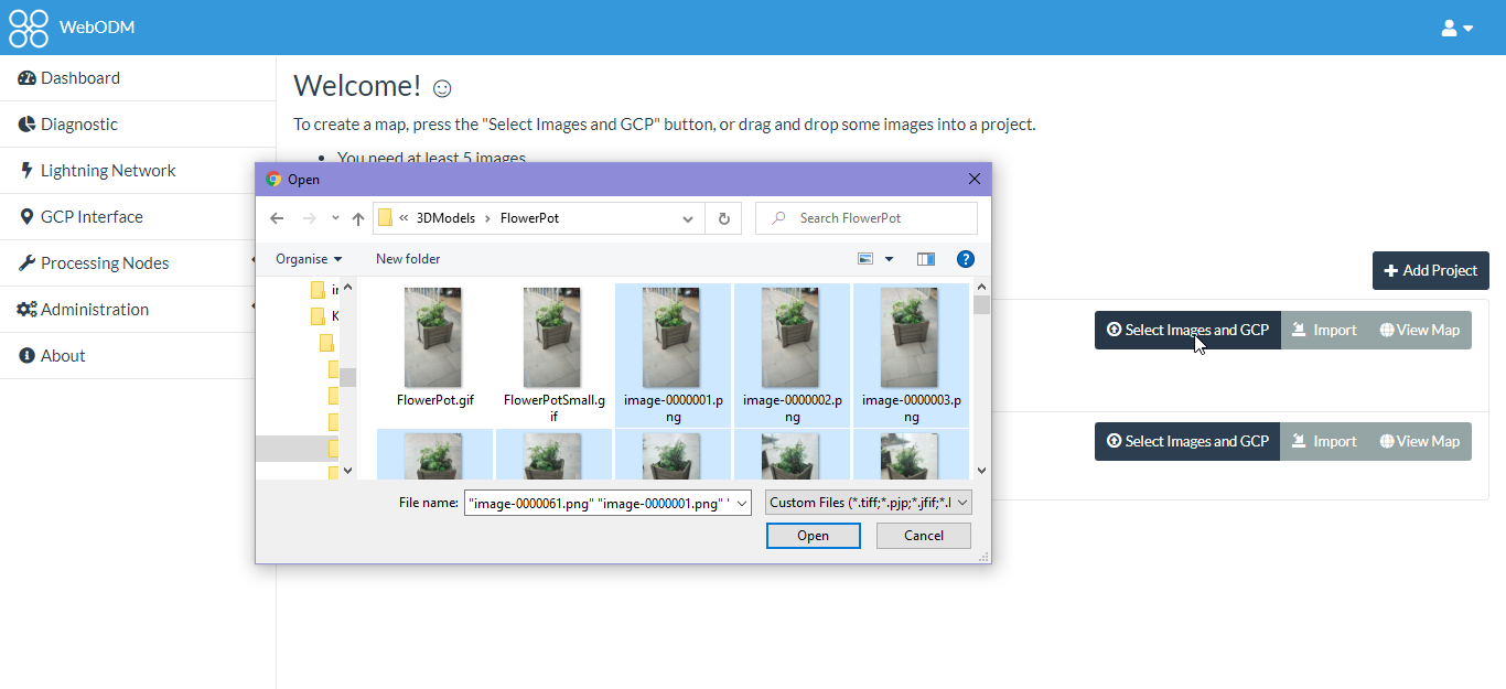 The exported .png images can now be imported into WebODM. Use the steps below to create a project and then load the images into WebODM: