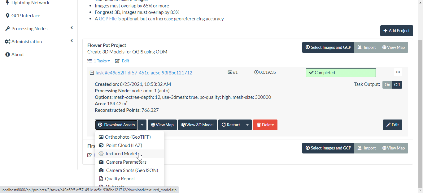If you used the ODM processing steps outlined in Option One: using WebODM, then after processing, download the assets for the textured model as shown below: