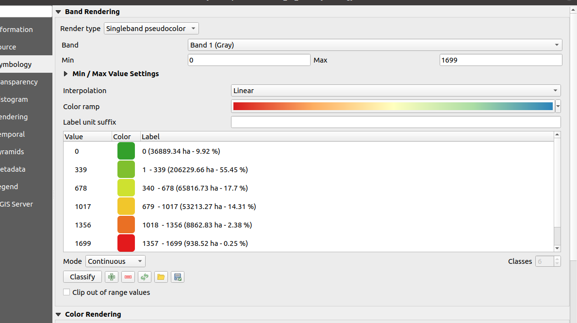 - The function style_raster defines the color ranges used to symbolise the raster, calculate the percentage coverage of each class with relation to the total area of the raster. Six classes are defined by calculating the min, max, and ranges from the raster statistics.