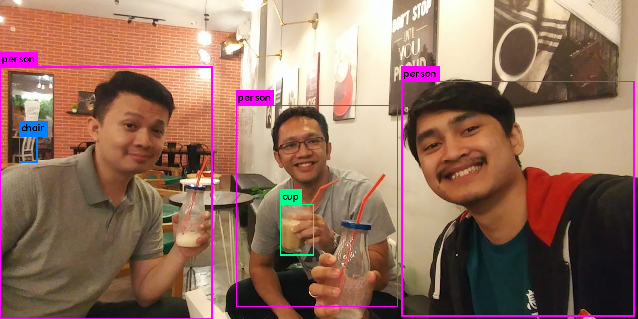 We have been doing R&D using AI to recognise objects in images. Here is a fun example of using Yolo on a picture of some of our team, Dimas, Boney, Rohmat, hanging out at a juice bar in in Surabaya, East Java Island, Indonesia.