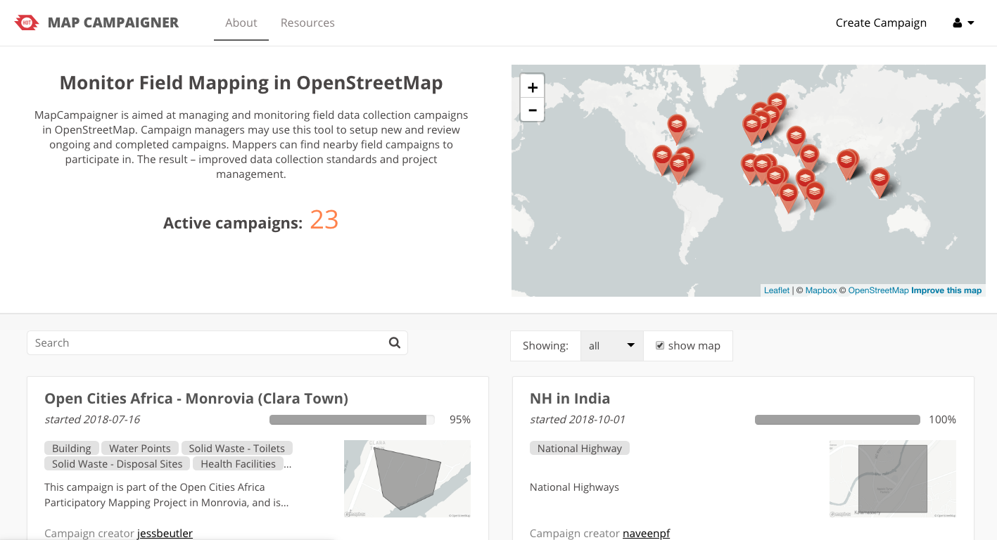 MapCampaigner: We worked with our friends at the Humanitarian OpenStreetmap Team (HOT) to develop a new version of MapCampaigner. “The OSM Campaign Manager project aims to bring field data collectors and campaign managers together on a single platform. Campaign managers are able to set up specific campaign types to evaluate the progress of field campaigns. Remote mapping projects can also be connected to campaigns.”